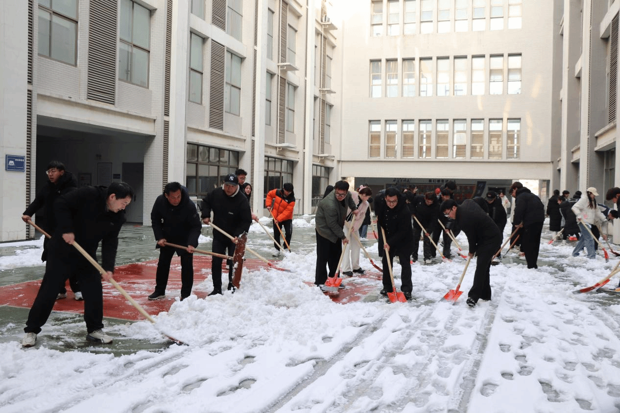 新学期新气象,2月25日,为保证开学第一天的教学活动正常进行,开云手机版登录入口领导班子成员、辅导员老师以及部分老师和主要学生干部,开展了扫雪除冰活动。