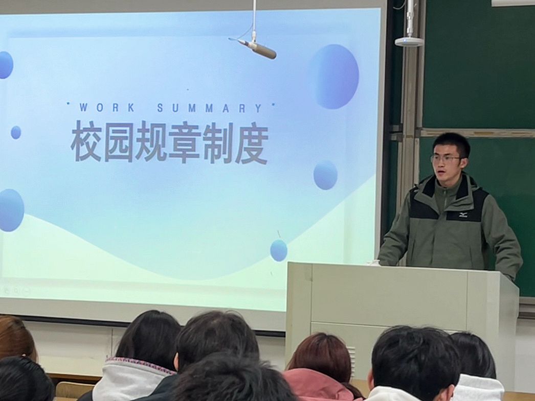 随后,开云手机版登录入口生活部部长韩晓海同学以“明规矩、守底线”为主题,带领新生们系统学习了校园规章制度。他结合体育专业学生的特点,用通俗易懂的语言详细解读了宿舍管理、纪律要求、奖惩机制等关键内容,明确告知新生在校期间的行为边界,让大家清楚知晓“能做什么、不能做什么”,帮助新生树立规则意识,避免因不知情而出现违规行为。