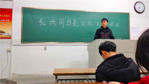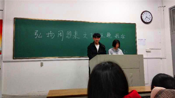 为了更好的了解与学习周恩来精神体院 1706团支部 在2018年3月31日开展了周恩来故事读书会。在书本上了解周总的伟大事例,以次 引发同学学习宣传恩来精神。增强班级凝聚力、同学之间的正能量交流,让体舞精神与恩来精神完美结合,挥洒独特的体舞人魅力。同学们积极参与本次的主题教育活动,在活动中分享了自己对周恩来总理故事的心得。让我们树立起目标,向总理看齐,学习周总理的优秀品质,优良作风!