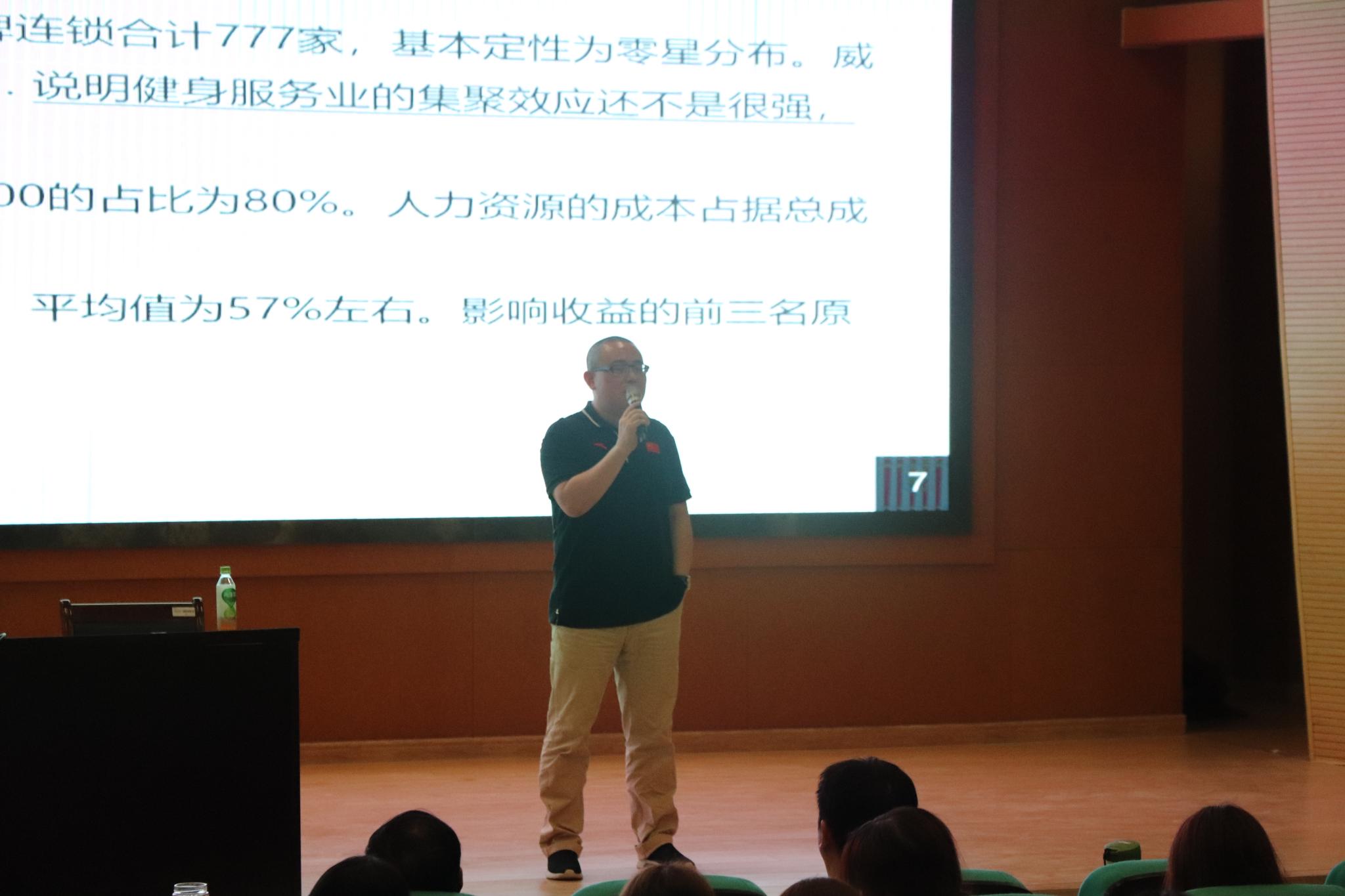 胡冠宇分别从“产”、 “学”、 “研”、 “用”四个方面向学生讲解了社会指导专业的社会需求现状与未来发展。重点论述了健康管理、运动训练、运动生理、运动解剖等基础课程的重要性,告诉同学们,目前,体育产业正在蓬勃发展,体育产业应用型人才培养的重要性和紧迫性正在凸显,体育产业迅猛发展对体育产业人才培养产业人才培养提出较大诉求,体育产业的未来发展人才需求正在显示巨大空间,希望同学们同学们要努力学习、积累能量,转变就业观念,实现多渠道、分层次、全方位的就业。