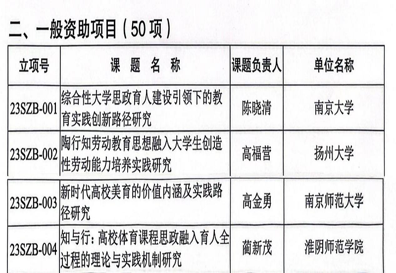 近日,江苏省社会科学联合会公布了“2023 年度应用研究精品工程高校思想政治教育专项课题”立项项目名单,本年度社科联共确定立项项目200项。其中,重点资助项目10项,一般资助项目50项,立项不资助项目140项;我院蔺新茂院长的专项课题《知与行:高校体育课程思政融入育人全过程的理论与实践机制研究》以一般资助项目第四名获得立项。
