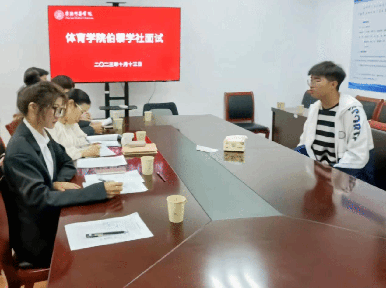 10月13日,在体院小会议室进行面试,包括自我介绍和提问两个环节。同学们充分表达对伯藜学社的认识,自我表达清晰流利,展现了当代大学生青春活力、自信自强的良好精神风貌。