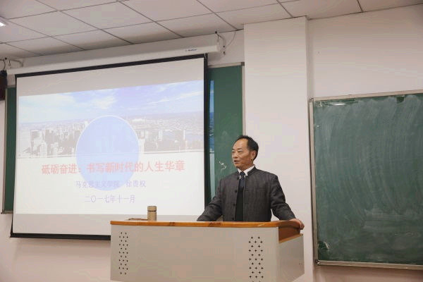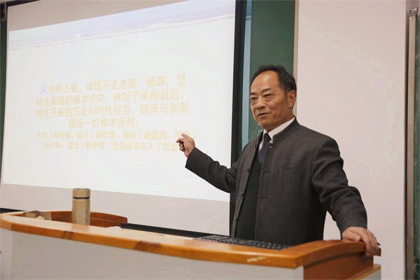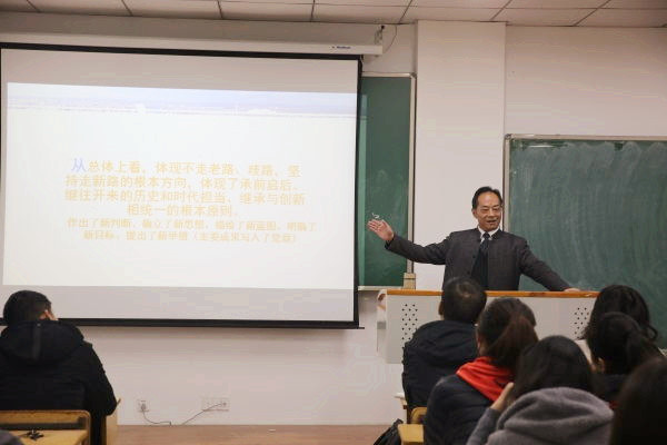 徐老师退休前一直在教学第一线,其有力度、有深度的讲课方式一直受到学生的喜欢,此次受到开云手机版登录入口邀请,徐老师专门精心制作PPT,用简单直观又有深度地语言为学生解读十九大。他从十九大报告结构分析入手:五年总结和重大判断、使命宣告、新思想和基本方略、目标和步骤、总体部署五个单元,分为八个方面为学生解读,重点解析如何把握我国社会主要矛盾的变化、如何认识全面建成小康社会和社会主义现代化强国、如何理解我们青年学生的重大历史使命等学生疑惑的关键问题。