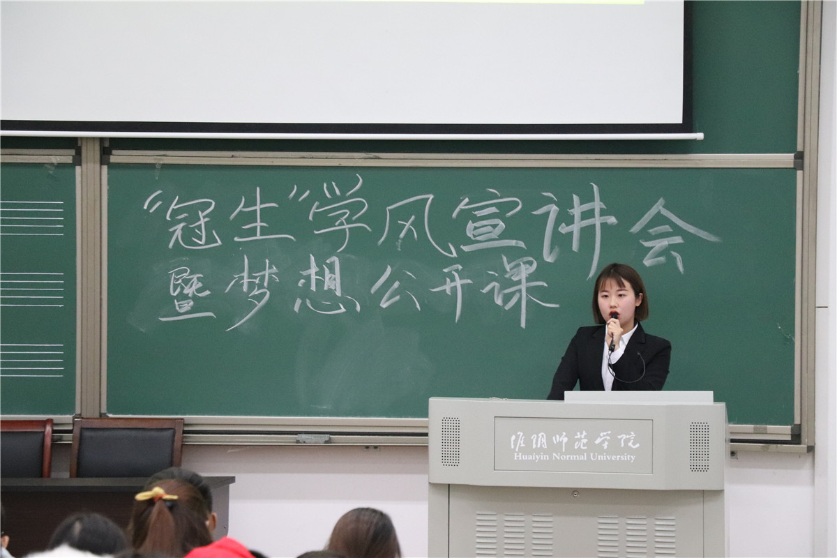 体院新闻网12月19日电(记者 陆灿)冠生学风宣讲会于2019年12月19日淮阴师范学院音乐楼A1-111开课。本次活动邀请到了“冠生”学风宣讲团成员,2019年国家奖学金获得者开云手机版登录入口1707班邬鑫波、美术学院1701班徐曦颖,19级全体学生参与此次讲座。